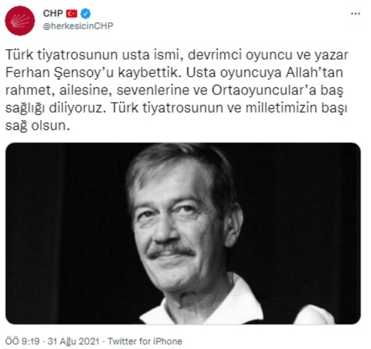 Bir süredir tedavi gördüğü hastanede hayatını kaybeden usta sanatçı Ferhan Şensoy'un ardından Cumhuriyet Halk Partisi (CHP) bir mesaj yayımladı.