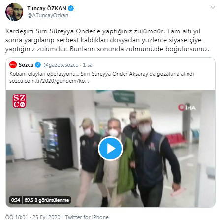 CHP İzmir Milletvekili Tuncay Özkan da Twitter hesabından, "Kardeşim Sırrı Süreyya Önder’e yaptığınız zulümdür. Tam altı yıl sonra yargılanıp serbest kaldıkları dosyadan yüzlerce siyasetçiye yaptığınız zulümdür. Bunların sonunda zulmünüzde boğulursunuz." diye yazdı.