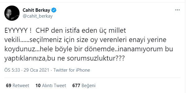 Sosyal medya hesabından açıklamalarda bulunan Berkay, "CHP den istifa eden üç millet vekili... Seçilmeniz için size oy verenleri enayi yerine koydunuz... Hele böyle bir dönemde... İnanamıyorum bu yaptıklarınıza; bu ne sorumsuzluktur?" ifadelerini kullandı.