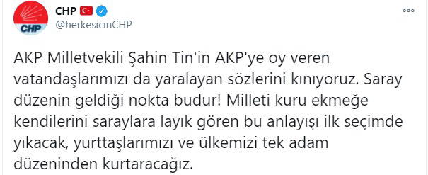 CHP'nin resmi sosyal medya hesabından yapılan açıklamada, "AKP Milletvekili Şahin Tin'in AKP'ye oy veren vatandaşlarımızı da yaralayan sözlerini kınıyoruz" denildi. Açıklama, "Saray düzenin geldiği nokta budur! Milleti kuru ekmeğe kendilerini saraylara layık gören bu anlayışı ilk seçimde yıkacak, yurttaşlarımızı ve ülkemizi tek adam düzeninden kurtaracağız" sözleriyle son buldu.