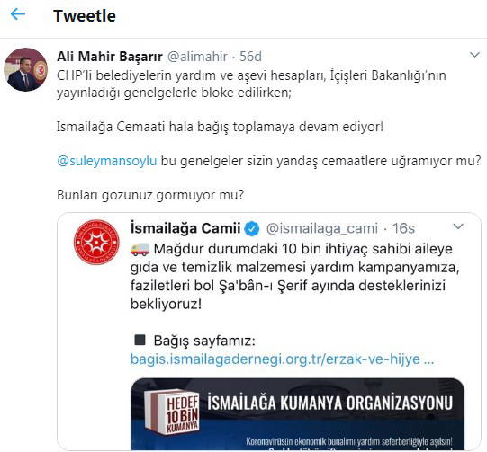 CHP Mersin Milletvekili Ali Mahir Başarır, kişisel twitter hesabından 'İsmailağa camii' adlı twitter hesabının 'desteklerinizi bekliyoruz' tweetini kopyalayarak İçişleri Bakanı Süleyman Soylu'ya 'bunları gözünüz görmüyor mu?' diyerek tepki gösterdi.