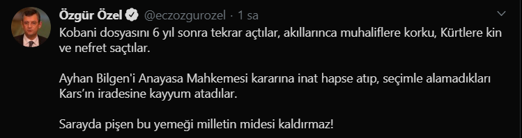 CHP Grup Başkanvekili Özgür Özel de sosyal medya hesabından "Kobani dosyasını 6 yıl sonra tekrar açtılar, akıllarınca muhaliflere korku, Kürtlere kin ve nefret saçtılar. Ayhan Bilgen'i Anayasa Mahkemesi kararına inat hapse atıp, seçimle alamadıkları Kars’ın iradesine kayyum atadılar. Sarayda pişen bu yemeği milletin midesi kaldırmaz!" diye yazdı.