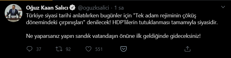 CHP Genel Başkan Yardımcısı Oğuz Kaan Salıcı ise "Türkiye siyasi tarihi anlatılırken bugünler için 'Tek adam rejiminin çöküş dönemindeki çırpınışları' denilecek! HDP'lilerin tutuklanması tamamıyla siyasidir. Ne yaparsanız yapın sandık vatandaşın önüne ilk geldiğinde gideceksiniz!" ifadelerini kullandı.