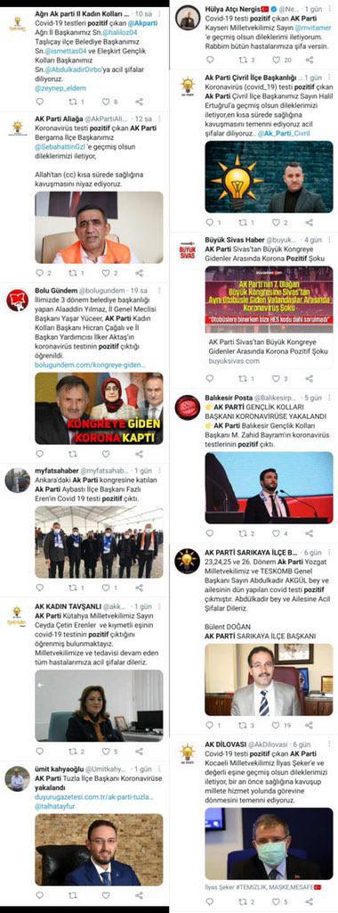 Adıgüzel'in yaptığı derlemeye göre AKP Kongresi sonrasında koronavirüse yakalandığını duyuran AKP’liler şöyle: