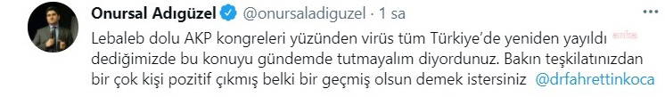 Adıgüzel, sosyal medya hesabından paylaştığı listeyle birlikte Sağlık Bakanı Fahrettin Koca'ya "Lebaleb dolu AKP kongreleri yüzünden virüs tüm Türkiye’de yeniden yayıldı dediğimizde bu konuyu gündemde tutmayalım diyordunuz. Bakın teşkilatınızdan bir çok kişi pozitif çıkmış belki bir geçmiş olsun demek istersiniz" diye seslendi.