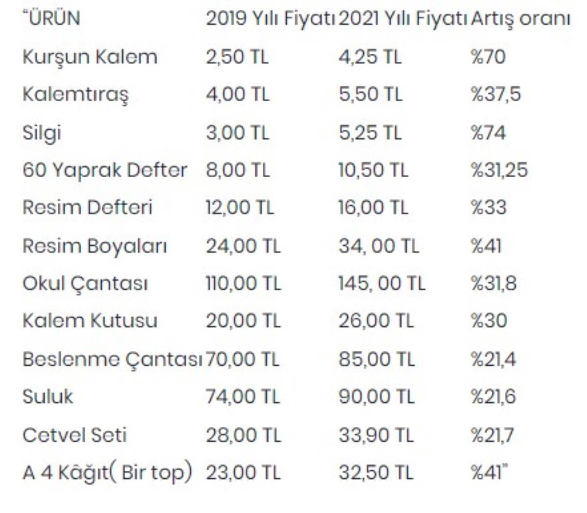 Ağbaba, kırtasiye malzemelerinin 2019 ve 2021 yıllarındaki fiyatlarını karşılaştırdı. Buna göre; bir adet silginin fiyatında 2 yıl öncesine göre yüzde 74, kurşun kalemin fiyatında yüzde 70, resim boyalarının fiyatında ise yüzde 41 oranında artış olduğunu gözlemlendi.