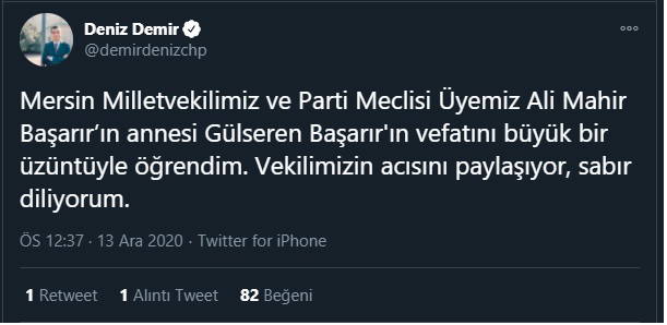 "Mersin Milletvekilimiz ve Parti Meclisi Üyemiz Ali Mahir Başarır’ın annesi Gülseren Başarır'ın vefatını büyük bir üzüntüyle öğrendim. Vekilimizin acısını paylaşıyor, sabır diliyorum."
