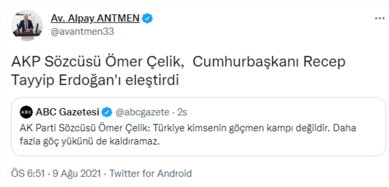 Antmen, "AKP Sözcüsü Ömer Çelik, Cumhurbaşkanı Recep Tayyip Erdoğan'ı eleştirdi" ifadelerini kullandı.