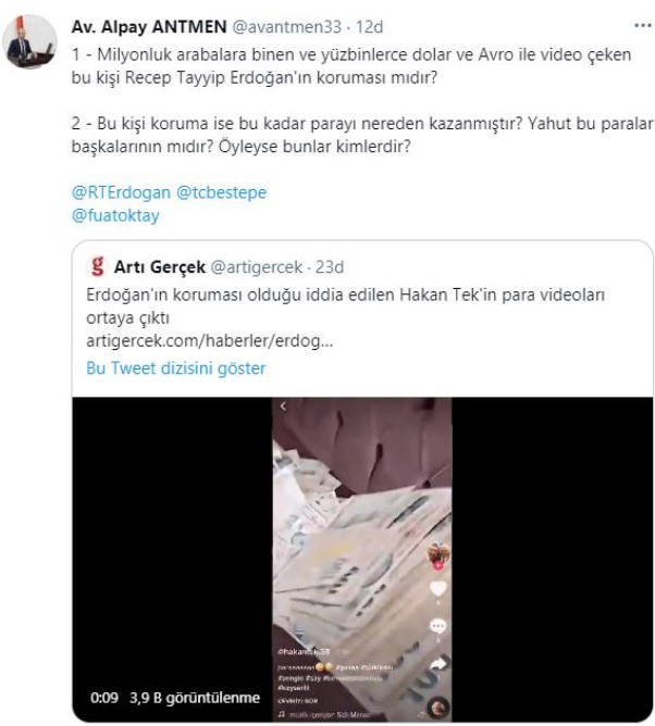 Cumhurbaşkanlığı'nda yakın koruma olduğu iddia edilen Hakan Tek'in TikTok hesabından paylaştığı videodaki para görüntüleri ortaya çıktı.