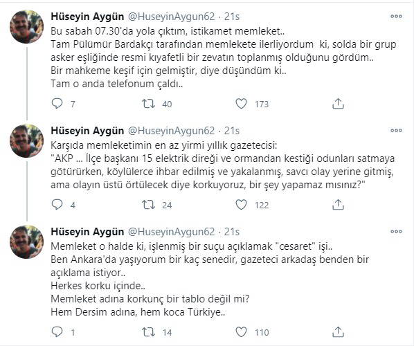 “Bu sabah 07.30’da yola çıktım, istikamet memleket… Tam Pülümür Bardakçı tarafından memlekete ilerliyordum ki, solda bir grup asker eşliğinde resmi kıyafetli bir zevatın toplanmış olduğunu gördüm. ‘Bir mahkeme keşif için gelmiştir’ diye düşündüm ki.. Tam o anda telefonum çaldı. Karşıda memleketimin en az yirmi yıllık gazetecisi: “AK Parti… İlçe başkanı 15 elektrik direği ve ormandan kestiği odunları satmaya götürürken, köylülerce ihbar edilmiş ve yakalanmış, savcı olay yerine gitmiş, ama olayın üstü örtülecek diye korkuyoruz, bir şey yapamaz mısınız?” Memleket o halde ki, işlenmiş bir suçu açıklamak “cesaret” işi… Ben Ankara’da yaşıyorum bir kaç senedir, gazeteci arkadaş benden bir açıklama istiyor… Herkes korku içinde. Memleket adına korkunç bir tablo değil mi? Hem Dersim adına, hem koca Türkiye..”