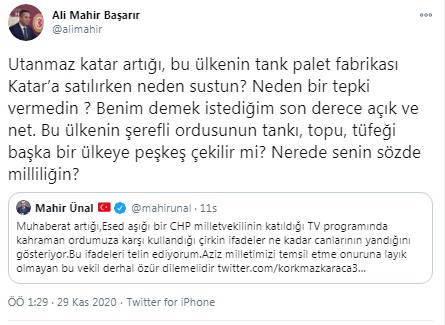 "Utanmaz Katar artığı, bu ülkenin Tank Palet Fabrikası Katar’a satılırken neden sustun? Neden bir tepki vermedin ? Benim demek istediğim son derece açık ve net. Bu ülkenin şerefli ordusunun tankı, topu, tüfeği başka bir ülkeye peşkeş çekilir mi? Nerede senin sözde milliliğin?"