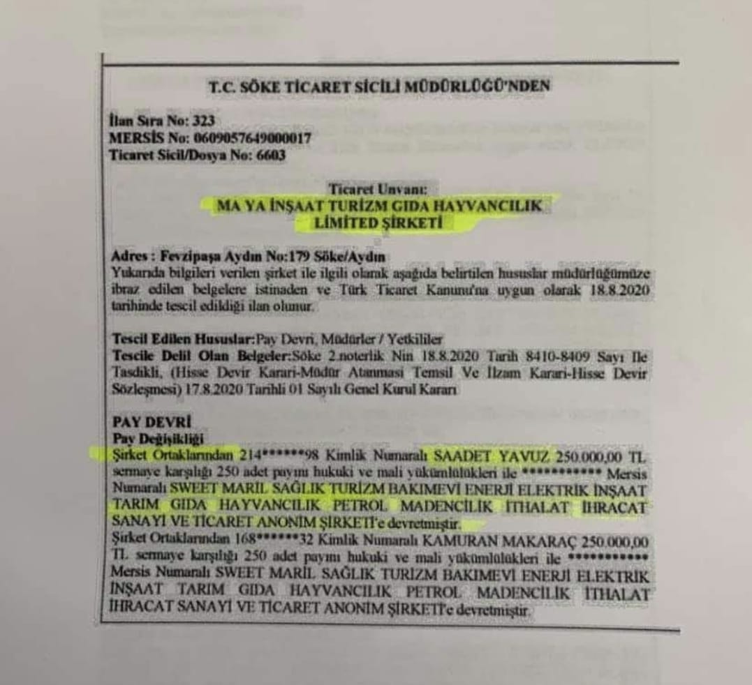 AKP’li vekilin eşinin yasadışı yapılan otelin sahibine hissesini devrettiğini belgeler ile açıklandığını anlatan Hamzaçebi, “Söke Ticaret Sicil gazetesindeki belgeye göre Maya İnşaat Turizm Gıda Hayvancılık limited şirketindeki hisselerini Metin Yavuz’un eşi 250 bin TL bedelle otelin şirketine devrediyor. Bir milletvekilinin eşi şirketini, yasadışı yapılmış otelin sahibinin şirketine devrediyor. Onlar da kendilerini sağlama almak için hisselerini başka birilerine devretmişler ki ortaklığım burada görünmesin anlayışı gütmüşler” diye konuştu.