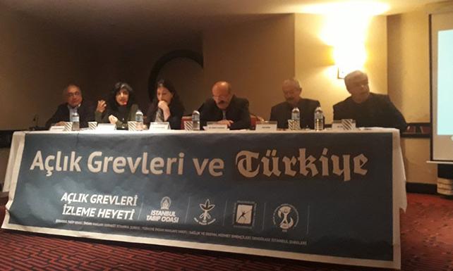 “Açlık Grevleri’nde Tıp Etiği ve Sağlıkçı Yaklaşımı” ve “Açlık Grevleri’nde Hukuk, İnsan Hakları ve Tarihsel Deneyimler” başlıklı iki oturum ile Taksim Hill Otel’de düzenlenen panelde Dr. Osman Öztürk, Dr. Ümit Biçer, Dr. Zeki Gül, Dr. Hakan Gürvit’in yanı sıra Av. Gülseren Yoleri, CHP İstanbul Mv. Mehmet Bekaroğlu, Akın Birdal, Av. Rengin Ergül ve Av. Öztürk Türkdoğan konuşmacı olarak yer aldı. Sağlık yaklaşımının etiği hakkında bilgi veren Dr. Zeki Gül “Mesleki özerklik sahibi olması gereken cezaevi doktorlarını yalnız bırakmamak için izleme heyeti kurmamamız gerekiyor. Bu doktorlar baskılar sebebiyle tıbbi müdahaleyi doğru uygulayamıyor. Bilimsel etik çerçevesinde tıbbi bir aktivizm başlatmak gerekiyor” açıklamasında bulundu. Dr. Ümit Biçer ise “Açlık grevini intiharla eşliyorlar, bu çok yanlış bir bakış açısı, hekimler olarak biz buna karşı çıkıyoruz” ifadelerini kullandı. Hukuk ve İnsan Hakları açısından kendi görüşlerini dile getiren CHP Mv. Mehmet Bekaroğlu “Ben açlık grevlerinin ve ölüm oruçlarının denenmesi gereken son yol dahi olmadığını düşünüyorum fakat eylemcileri anlayabiliyorum. Türkiye’nin geçmişte ve bugün içinden geçtiği hukuksuz süreçlerde hak arama mücadelesinin resmi zemininde karşılığı olmuyor, insan hakları savunucuları bunun bir propaganda aracı haline gelmesine izin vermeden kamuoyuna anlatmalı ve kitleselleştirmeli” ifadelerini kullandı.
