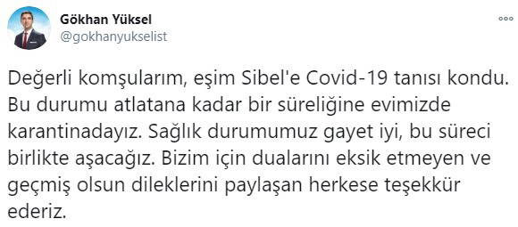 “Değerli komşularım, eşim Sibel’e Covid-19 tanısı kondu. Bu durumu atlatana kadar bir süreliğine evimizde karantinadayız. Sağlık durumumuz gayet iyi, bu süreci birlikte aşacağız. Bizim için dualarını eksik etmeyen ve geçmiş olsun dileklerini paylaşan herkese teşekkür ederiz.”