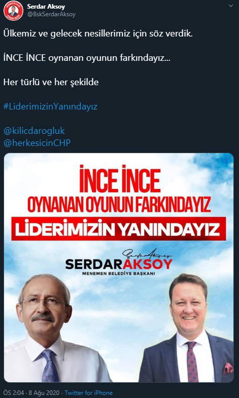 Menemen Belediye Başkanı Aksoy, sosyal medya üzerinden CHP Genel Başkanı Kemal Kılıçdaroğlu ile birlikte bir fotoğrafını paylaşarak “İNCE İNCE OYNANAN OYUNUN FARKINDAYIZ LİDERİMİZİN YANINDAYIZ” notunu düştü.