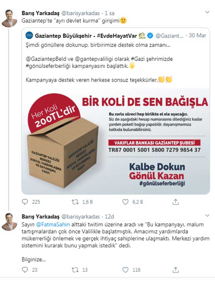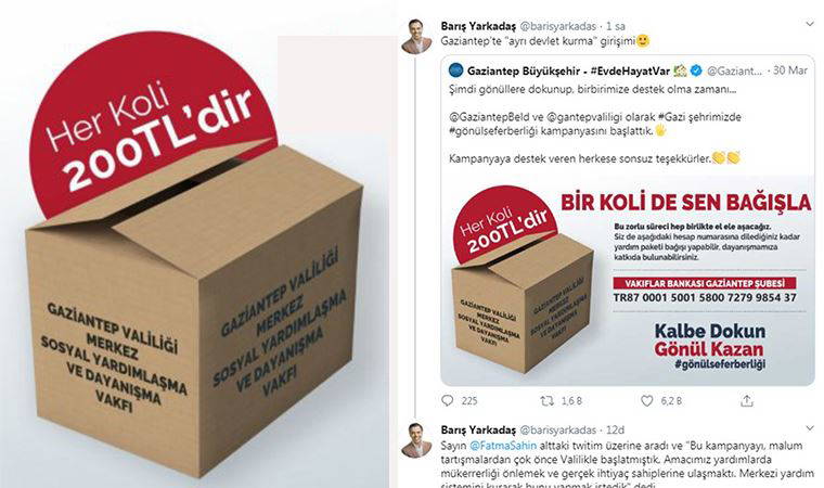 Yardım kampanylarının yasaklanması gündemdeyken, AKP'li belediyelerde bu yasağın geçerli olmadığı ortaya çıktı. AKP yönetimindeki Konya ve Gaziantep belediyelerinin kampanya düzenlediklerini ortaya çıkaran CHP'li vekil Barış Yarkadaş konuyu hesabından, “Gaziantep’te 'ayrı devlet kurma' girişimi” şeklinde duyurdu.