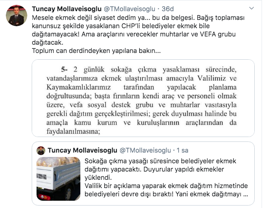 Gazetemiz Ege Bölge Temsilcisi Tuncay Mollaveisoğlu,karar metnini sosyal medya hesabından “Mesele ekmek değil siyaset dedim ya bu da belgesi. Bağış toplaması kanunsuz şekilde yasaklanan CHP’li belediyeler ekmek bile dağıtamayacak! Ama araçlarını verecekler muhtarlar ve VEFA grubu dağıtacak. Toplum can derdindeyken yapılana bakın” sözleriyle duyurdu.