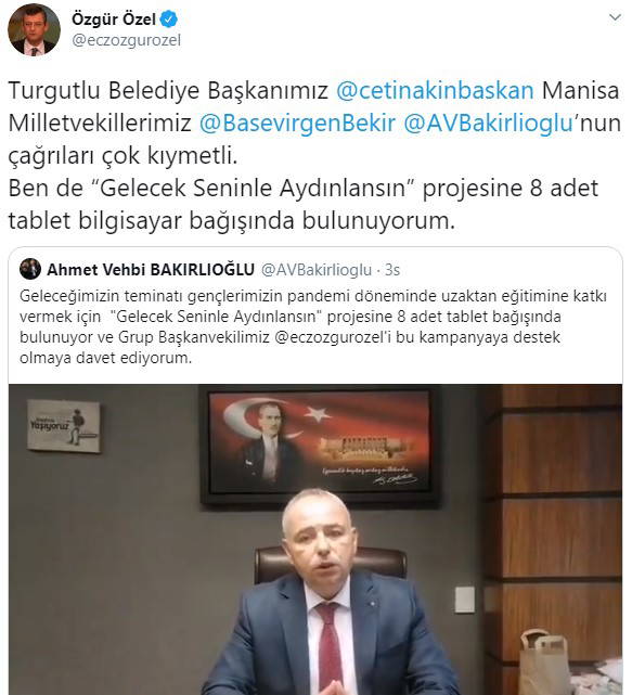 "Turgutlu Belediye Başkanımız @cetinakinbaskan, Manisa Milletvekillerimiz @BasevirgenBekir, @AVBakirlioglu ’nun çağrıları çok kıymetli. Ben de “Gelecek Seninle Aydınlansın” projesine 8 adet tablet bilgisayar bağışında bulunuyorum.