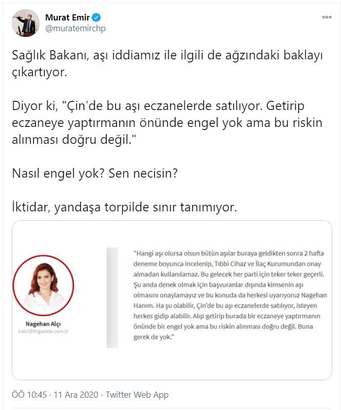 “Çin aşısı 10 gündür Türkiye’de. Aşıyı getiren firma da her zamanki gibi yine Keymen İlaç oldu. Aşı 10 gündür el altından AKP’li siyasilere, aile dostlarına, nüfuzlu kişilere ve tanıdıklara yapılmaya başlanmış bile.”