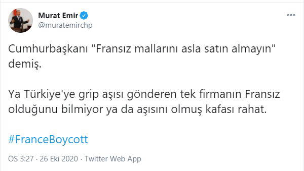 Sosyal medya hesabı üzerinden açıklama yapan Emir, "Cumhurbaşkanı 'Fransız mallarını asla satın almayın' demiş. Ya Türkiye'ye grip aşısı gönderen tek firmanın Fransız olduğunu bilmiyor ya da aşısını olmuş kafası rahat" ifadelerini kullandı.