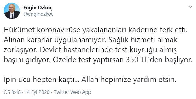 "Hükümet koronavirüse yakalananları kaderine terk etti" diyen Özkoç, alınan kararların da uygulanmadığını vurgulayarak, "Sağlık hizmeti almak zorlaşıyor. Devlet hastanelerinde test kuyruğu almış başını gidiyor. Özelde test yaptırsan 350 TL'den başlıyor. İpin ucu hepten kaçtı. Allah hepimize yardım etsin" dedi.