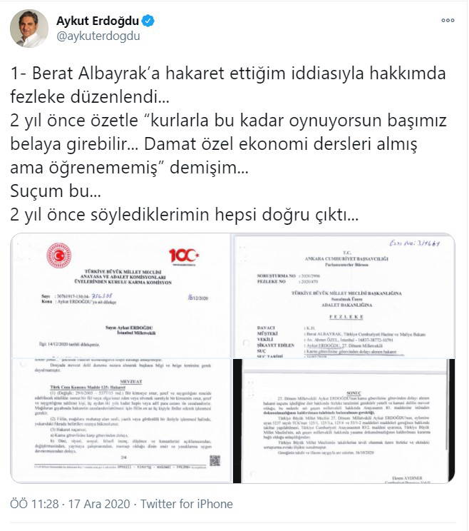 “Berat Albayrak’a hakaret ettiğim iddiasıyla hakkımda fezleke düzenlendi. 2 yıl önce özetle ‘Kurlarla bu kadar oynuyorsun başımız belaya girebilir. Damat özel ekonomi dersleri almış ama öğrenememiş’ demişim. Suçum bu... 2 yıl önce söylediklerimin hepsi doğru çıktı...