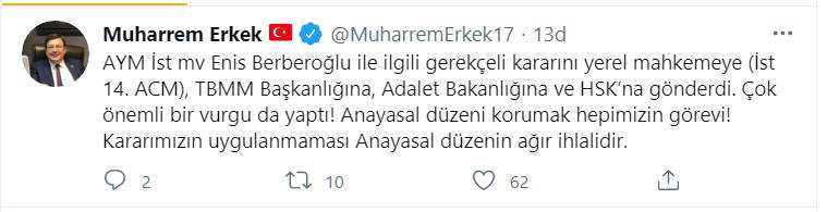 "AYM İstanbul vekili Enis Berberoğlu ile ilgili gerekçeli kararını yerel mahkemeye (İst 14. ACM), TBMM Başkanlığına, Adalet Bakanlığına ve HSK’ye gönderdi. Çok önemli bir vurgu da yaptı! 'Anayasal düzeni korumak hepimizin görevi! Kararımızın uygulanmaması Anayasal düzenin ağır ihlalidir' " bilgisini paylaştı.