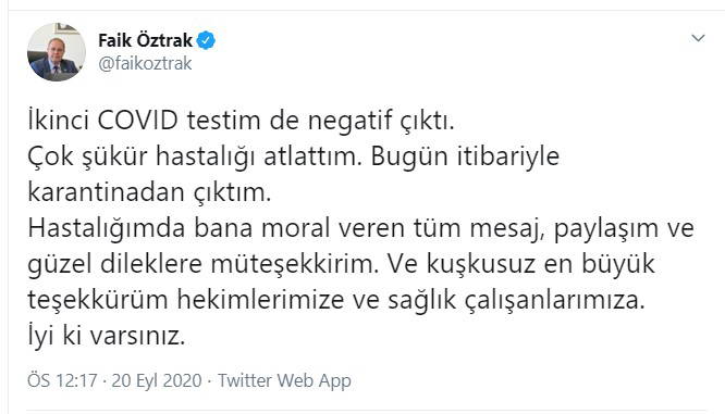 “İkinci COVID testim de negatif çıktı. Çok şükür hastalığı atlattım. Bugün itibariyle karantinadan çıktım. Hastalığımda bana moral veren tüm mesaj, paylaşım ve güzel dileklere müteşekkirim. Ve kuşkusuz en büyük teşekkürüm hekimlerimize ve sağlık çalışanlarımıza. İyi ki varsınız.”
