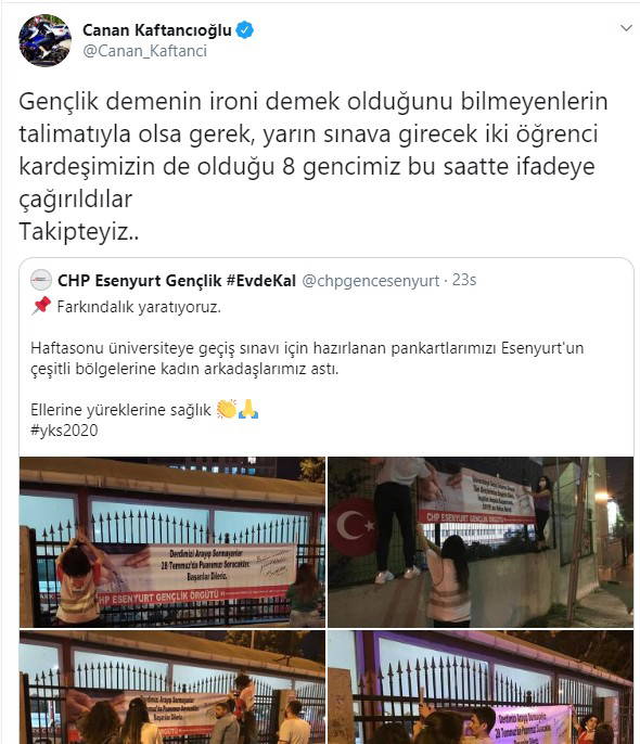 "Gençlik demenin ironi demek olduğunu bilmeyenlerin talimatıyla olsa gerek, yarın sınava girecek iki öğrenci kardeşimizin de olduğu 8 gencimiz bu saatte ifadeye çağırıldılar. Takipteyiz."