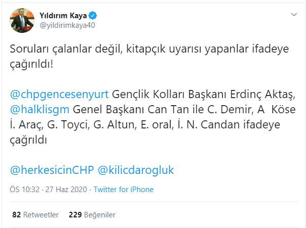 CHP Genel Başkan Yardımcısı Yıldırım Kaya da CHP'li öğrencilerin ifadeye çağırılmasına tepki gösterdi. Kaya Twitter'dan yaptığı açıklamada, "Soruyu çalanlar değil, kitapçık uyarısı yapanlar ifadeye çağırıldı." dedi.