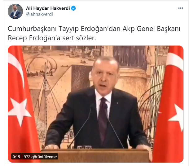 Erdoğan'ın konuşmasındaki bu bölümü sosyal medya hesabından yayınlayan CHP'li Hakverdi, "Cumhurbaşkanı Tayyip Erdoğan’dan AKP Genel Başkanı Recep Erdoğan’a sert sözler" ifadelerini kullandı.