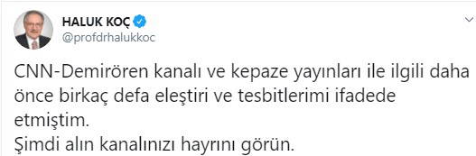 Koç paylaşımında, "CNN-Demirören kanalı ve kepaze yayınları ile ilgili daha önce birkaç defa eleştiri ve tesbitlerimi ifadede etmiştim. Şimdi alın kanalınızı hayrını görün." ifadelerini kullandı.