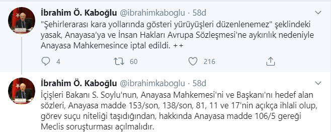 Ayrıca Kaboğlu, 'şehirlerarası karayollarındaki gösteri yürüyüşleri düzenlenemez' şeklindeki yasağın, Anayasa'ya ve İnsan Hakları Avrupa Sözleşmesi'ne aykırılık nedeniyle Anayasa Mahkemesi tarafından iptal edildiğini anımsattı.