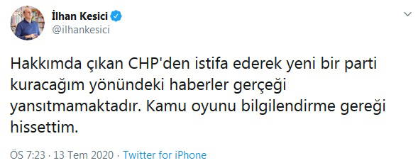 "Hakkımda çıkan CHP'den istifa ederek yeni bir parti kuracağım yönündeki haberler gerçeği yansıtmamaktadır. Kamu oyunu bilgilendirme gereği hissettim"