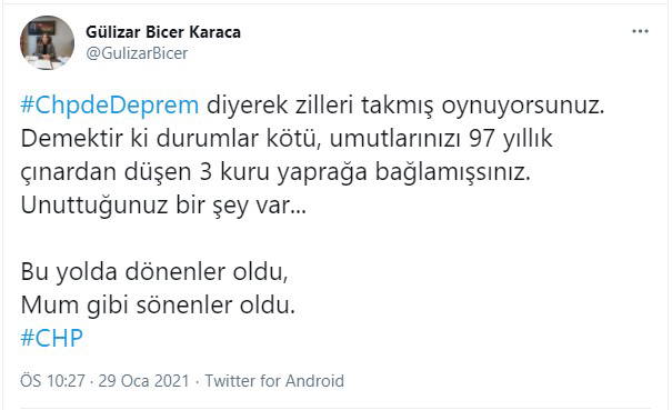Karaca, paylaşımında, " 'CHP'de deprem' diyerek zilleri takmış oynuyorsunuz. Demektir ki durumlar kötü, umutlarınızı 97 yıllık çınardan düşen 3 kuru yaprağa bağlamışsınız. Unuttuğunuz bir şey var... Bu yolda dönenler oldu, mum gibi sönenler oldu" ifadelerine yer verdi.