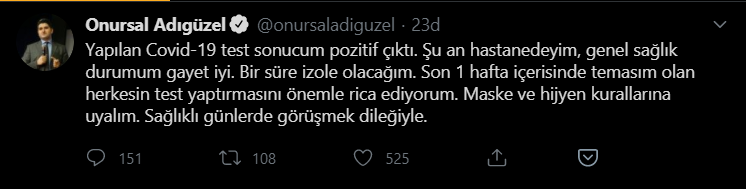 "Yapılan Covid-19 test sonucum pozitif çıktı. Şu an hastanedeyim, genel sağlık durumum gayet iyi. Bir süre izole olacağım. Son 1 hafta içerisinde temasım olan herkesin test yaptırmasını önemle rica ediyorum. Maske ve hijyen kurallarına uyalım. Sağlıklı günlerde görüşmek dileğiyle."