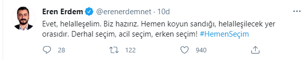 Eren Erdem ise, "Evet, helalleşelim. Biz hazırız. Hemen koyun sandığı, helalleşilecek yer orasıdır. Derhal seçim, acil seçim, erken seçim! Hemen seçim" diye yazdı.