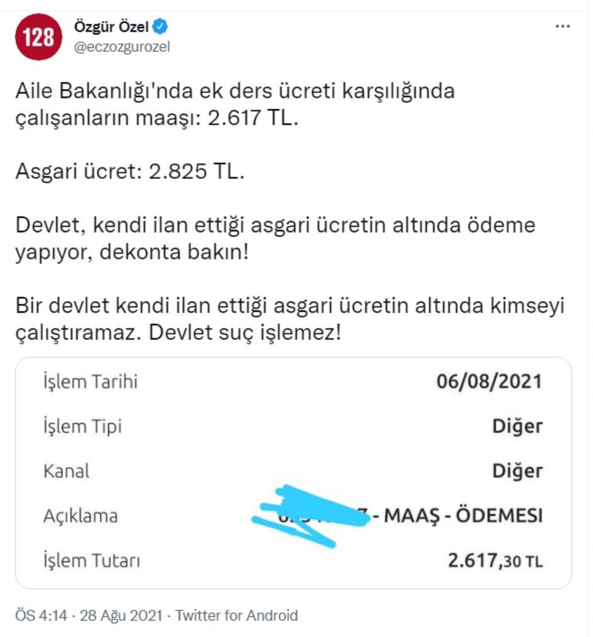 Yaşanan duruma sosyal medya hesabından tepki gösteren Özel, ''Aile Bakanlığı'nda ek ders ücreti karşılığında çalışanların maaşı, 2 bin 617 TL. Asgari ücret 2 bin 825 TL. Devlet, kendi ilan ettiği asgari ücretin altında ödeme yapıyor, dekonta bakın! Bir devlet kendi ilan ettiği asgari ücretin altında kimseyi çalıştıramaz. Devlet suç işlemez'' ifadelerini kullandı.