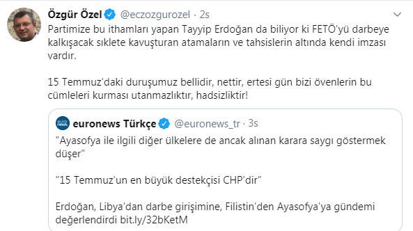"Partimize bu ithamları yapan Tayyip Erdoğan da biliyor ki FETÖ'yü darbeye kalkışacak sıklete kavuşturan atamaların ve tahsislerin altında kendi imzası vardır. 15 Temmuz'daki duruşumuz bellidir, nettir, ertesi gün bizi övenlerin bu cümleleri kurması utanmazlıktır, hadsizliktir!"