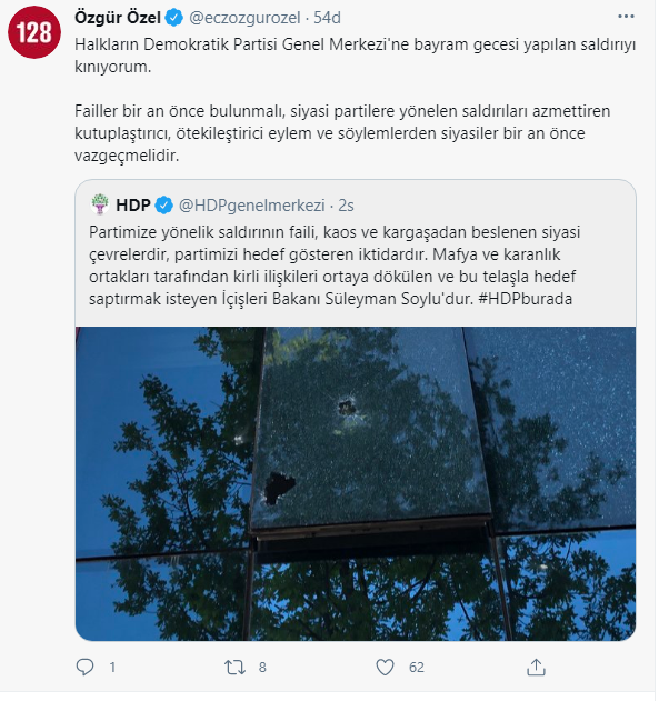 Açıklamayı alıntılayan CHP Grup Başkanvekili Özgür Özel, sosyal medya hesabından "Halkların Demokratik Partisi Genel Merkezi'ne bayram gecesi yapılan saldırıyı kınıyorum. Failler bir an önce bulunmalı, siyasi partilere yönelen saldırıları azmettiren kutuplaştırıcı, ötekileştirici eylem ve söylemlerden siyasiler bir an önce vazgeçmelidir" sözleriyle olaya tepki gösterdi.