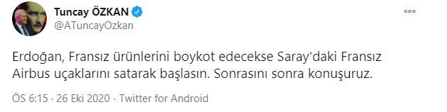 Sosyal medya hesabından konuyla ilişkin açıklamalarda bulunan Tuncay Özkan, “Erdoğan, Fransız ürünlerini boykot edecekse Saray'daki Fransız Airbus uçaklarını satarak başlasın. Sonrasını sonra konuşuruz” dedi.