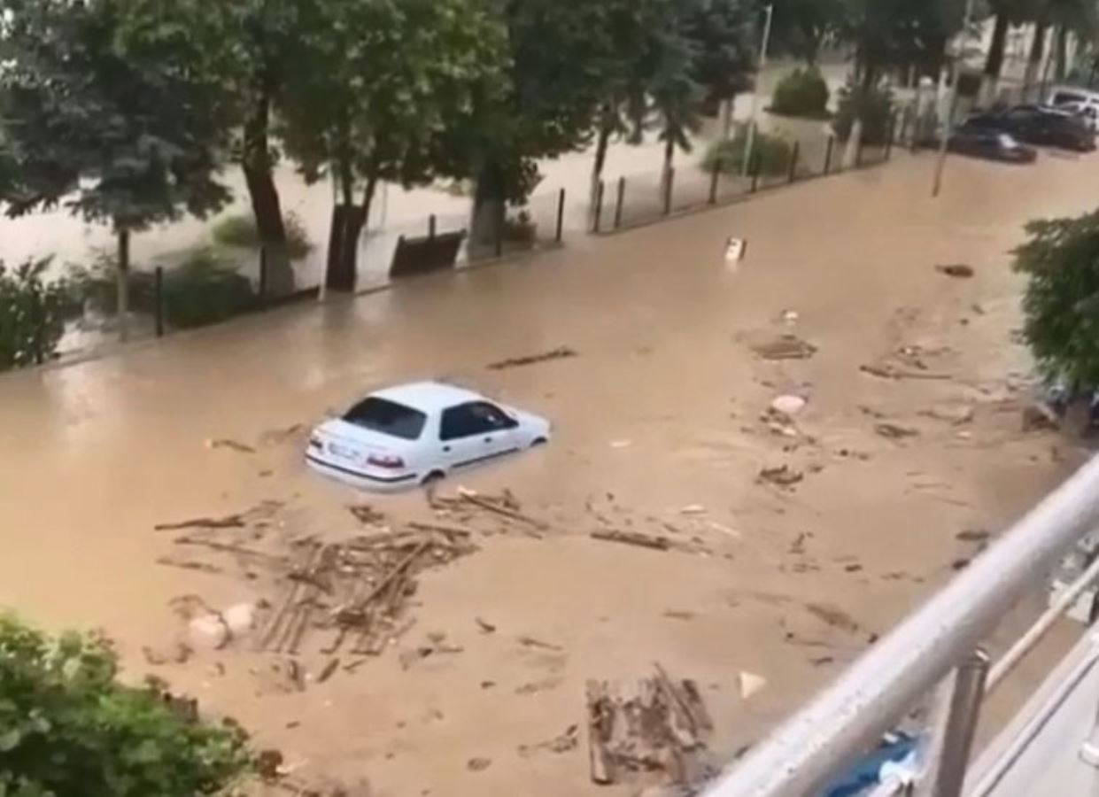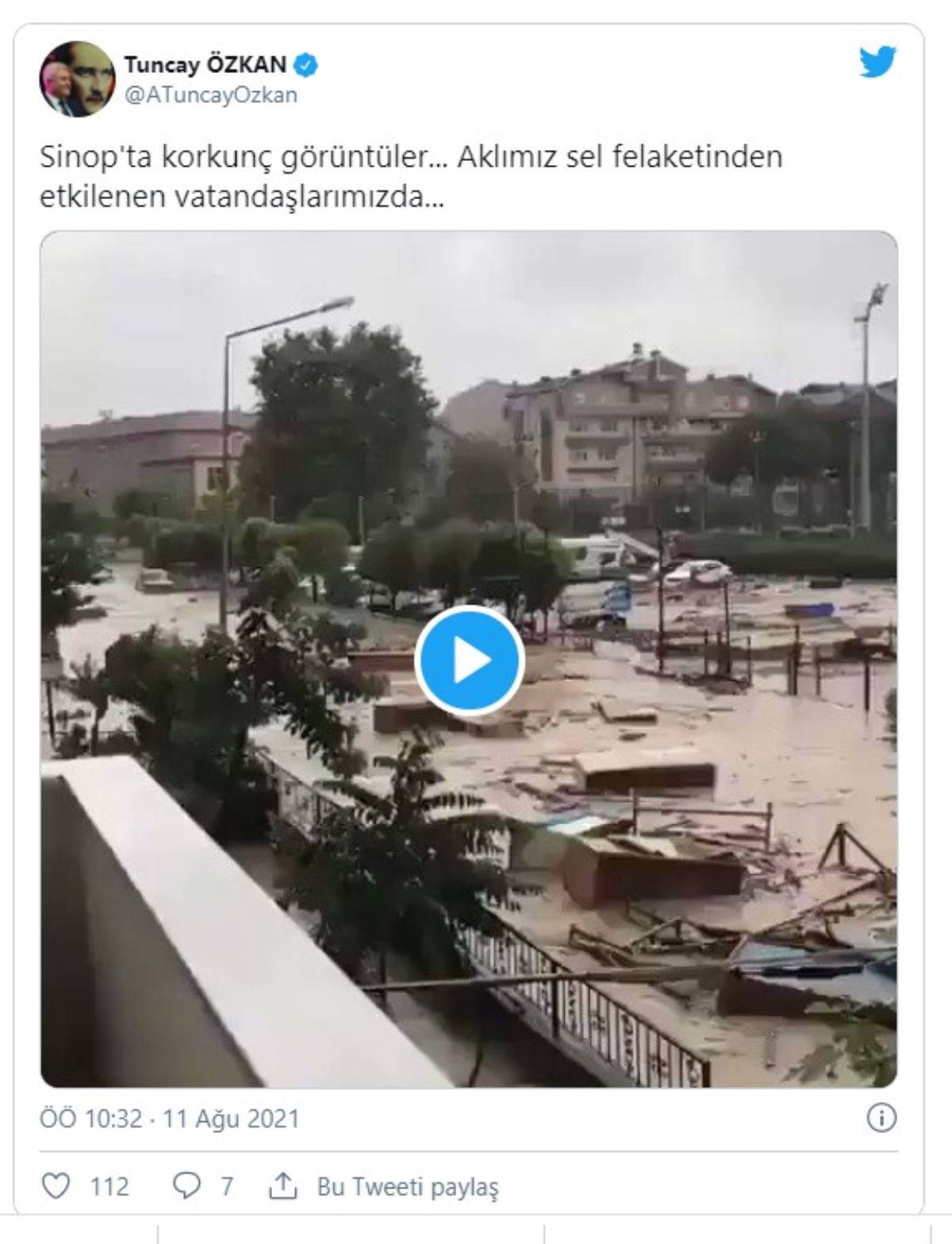 Özkan'ın, "Sinop'ta korkunç görüntüler... Aklımız sel felaketinden etkilenen vatandaşlarımızda" notuyla paylaşılan videoda dehşete düşüren görüntüler yer aldı.