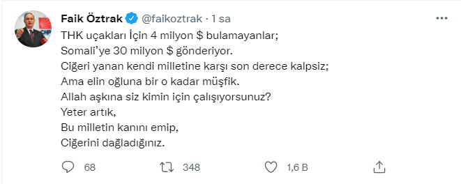 CHP Sözcüsü Faik Öztrak, Cumhurbaşkanlığı Kararnamesi'yle Somali'ye yıllık 30 milyon dolar hibe gönderilmesine tepki gösterdi. AKP Genel Başkanı ve Cumhurbaşkanı Recep Tayyip Erdoğan'ı sert sözlerle eleştiren CHP Sözcüsü Öztrak, "THK uçakları İçin 4 milyon dolar bulamayanlar; Somali’ye 30 milyon dolar gönderiyor. Allah aşkına siz kimin için çalışıyorsunuz?" ifadelerini kullandı.