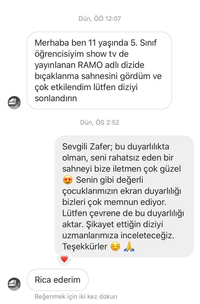 RTÜK, önceki gün sosyal medya hesabından 11 yaşındaki bir çocukla mesajlaşmalarını paylaştı. Söz konusu mesajlarda 11 yaşındaki çocuğun, televizyonda yayımlanan bir dizede yaşanan bıçaklama sahnesinden çok etkilendiği ve "lütfen diziyi sonlandırın" dediği görüldü. RTÜK ise 11 yaşındaki çocuğa verdiği yanıtta, şu ifadeleri kullandı: