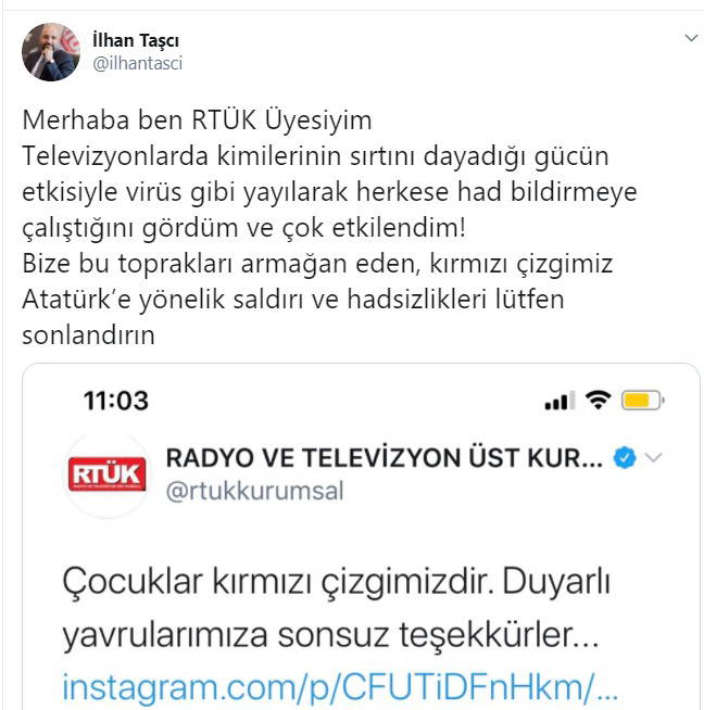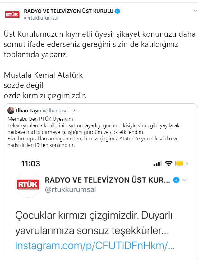 RTÜK de sosyal medya hesabından Taşçı’nın paylaşımını alıntılayarak, “Üst Kurulumuzun kıymetli üyesi; şikayet konunuzu daha somut ifade ederseniz gereğini sizin de katıldığınız toplantıda yaparız. Mustafa Kemal Atatürk sözde değil, özde kırmızı çizgimizdir” ifadesini kullandı.
