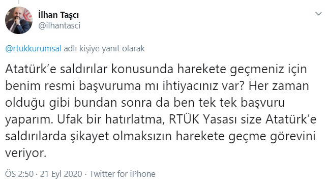 “Atatürk’e saldırılar konusunda harekete geçmeniz için benim resmi başvuruma mı ihtiyacınız var? Her zaman olduğu gibi bundan sonra da ben tek tek başvuru yaparım. Ufak bir hatırlatma, RTÜK Yasası size Atatürk’e saldırılarda şikayet olmaksızın harekete geçme görevini veriyor.”