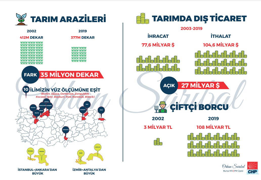 AKP iktidarında köylerin tüzel kişilikleri yok edilerek mahalleye dönüştürülmüş; köyler, otlak ve meralar piyasaya açılmış, tarım toprakları betona teslim edilmiş, yağmalanmıştır. Çiftçilerin kullandığı gübre, mazot, yem gibi temel girdilerin fiyatlarındaki artışlar, ürün fiyatlarındaki artışların çok üstünde gerçekleşmiştir.