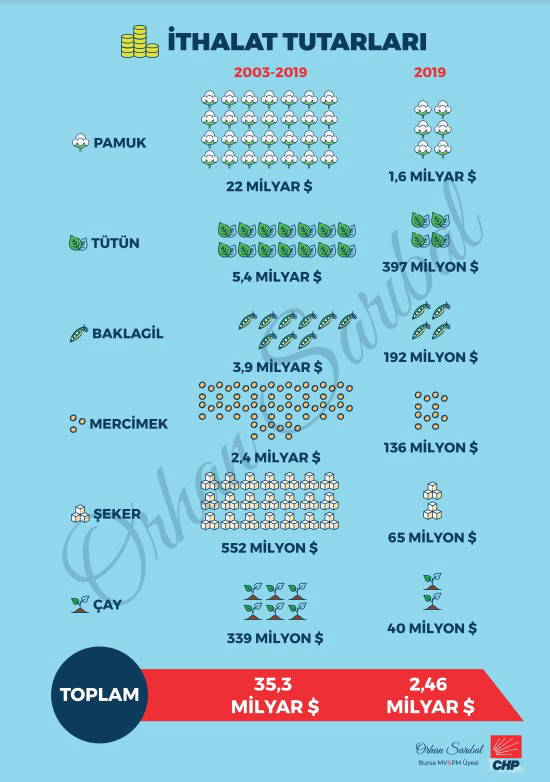 Nüfusumuz her yıl 1 milyona yakın artarken, tarım üretimi ülke insanının ihtiyacını karşılayamaz duruma geldi. AKP bu açığı ithalat ile kapatmaya çalıştı.