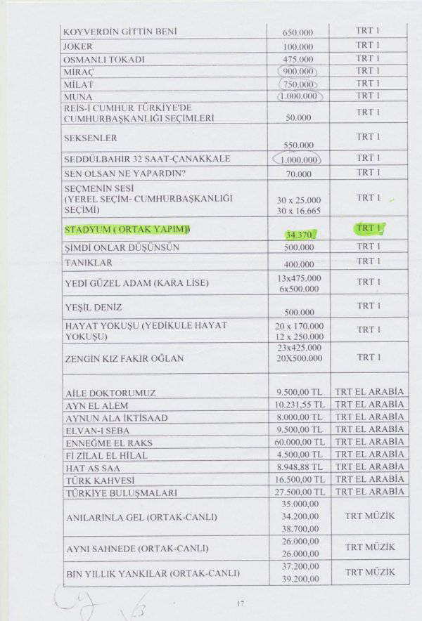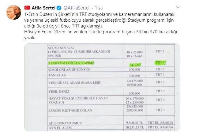 1-Ersin Düzen’in Şirketi’nin TRT stüdyolarını ve kameramanlarını kullanarak ve yanına üç eski futbolcuyu alarak gerçekleştirdiği Stadyum programı için aldığı ücreti üç yıl önce TRT açıklamıştı.Hüseyin Ersin Düzen i’in verilen listede program başına 34 bin 370 lira aldığı yazılı.