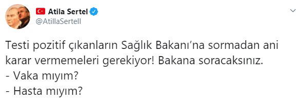 CHP İzmir Milletvekili Atila Sertel sosyal medya hesabı üzerinden imalı bir dille Bakan Koca'yı eleştirdi. Sertel, "Testi pozitif çıkanların Sağlık Bakanı’na sormadan ani karar vermemeleri gerekiyor! Bakana soracaksınız. - Vaka mıyım? - Hasta mıyım?" diyerek tepki gösterdi.
